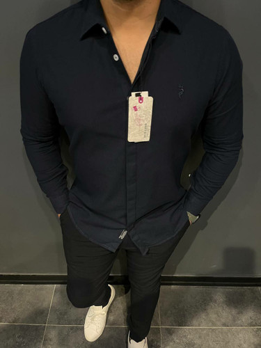 پیراهن مردانه آستین بلند تکرنگ سرمه ای تیره دکمه مخفی