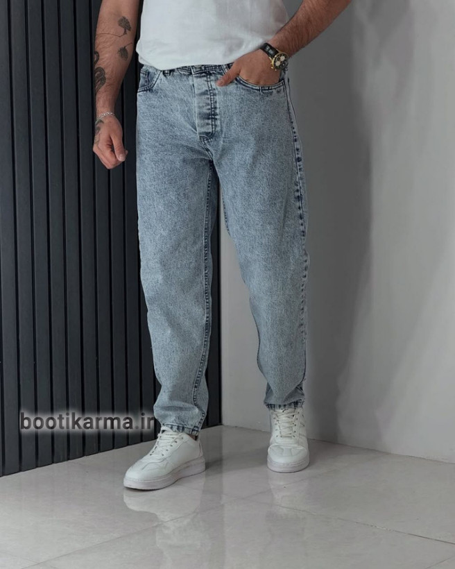 شلوار مام فیت مردانه رنگ آبی یخی به خاطر تنخوری راحت و زیبا، یکی از پرطرفدارترین مدلهای شلوار جین مردانه است.