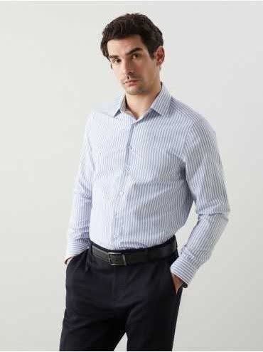 راهراه بودن پارچه باعث میشود که این پیراهن ظاهری خاص و متفاوت نسبت به پیراهنهای ساده داشته باشد. این طرح هم برای استایل رسمی و هم برای استایل کژوال مناسب است.